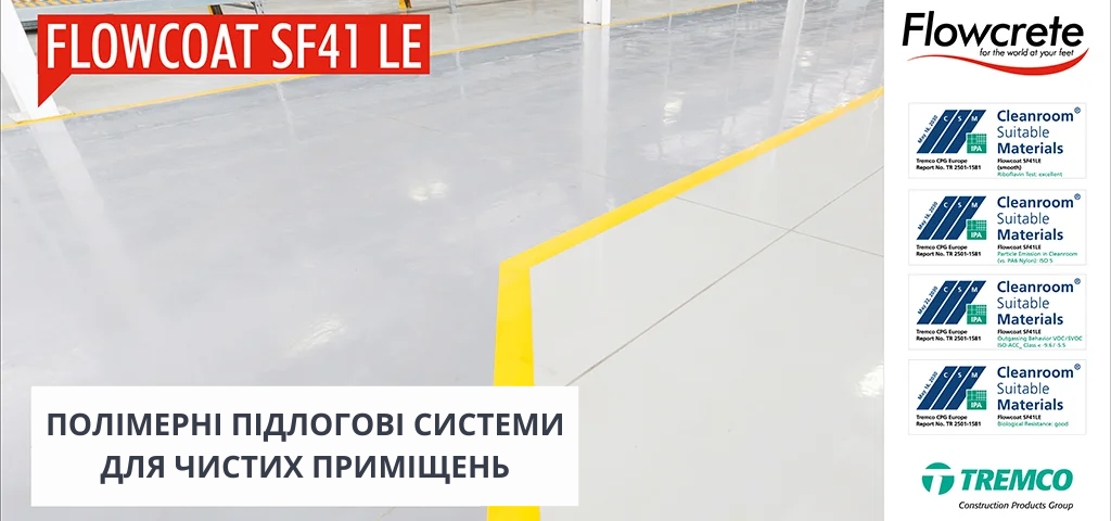 Flowcoat SF41 LE — це спеціальна низькоемісійна версія покриття Flowcoat SF41, розроблена для приміщень з більш жорсткими вимогами до якості повітря та рівня чистоти. Система відрізняється зменшеним вмістом летких органічних сполук, що робить її придатною для використання у чистих приміщеннях (cleanroom).